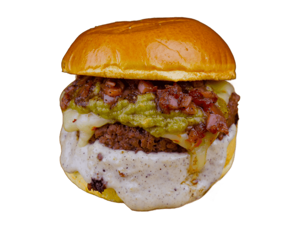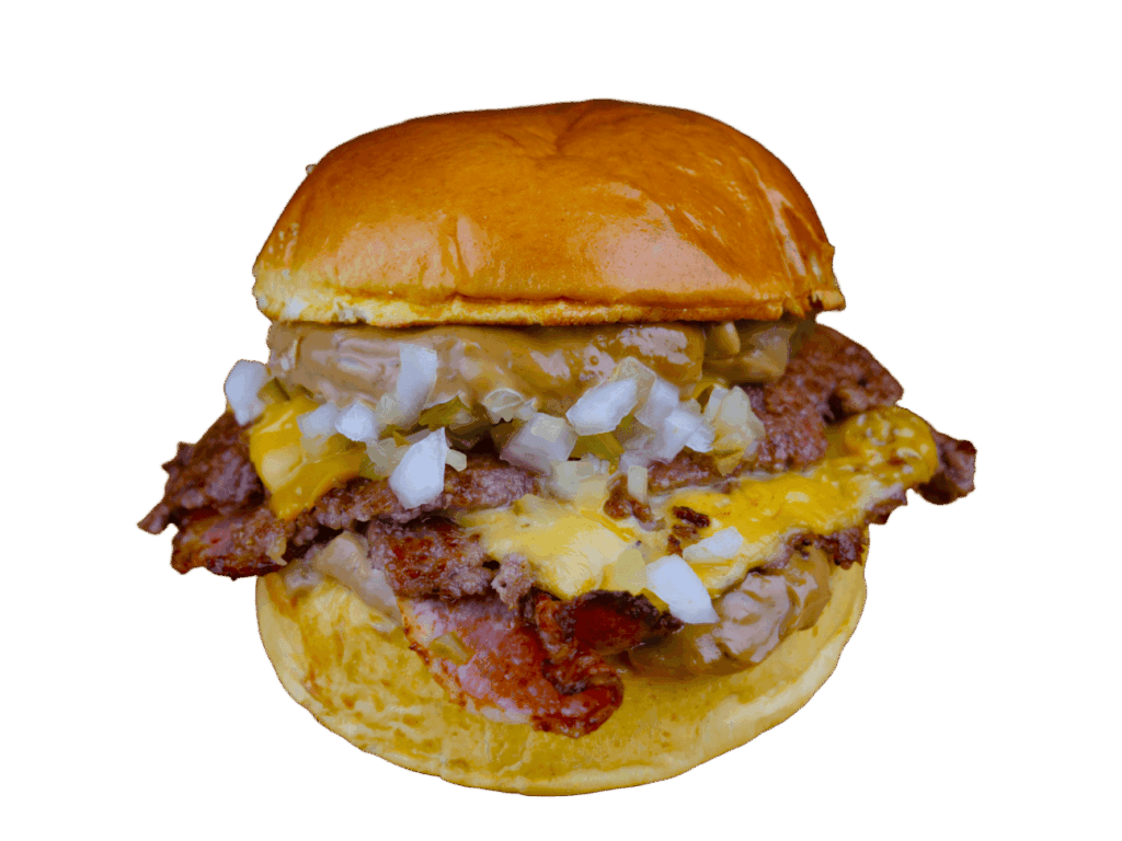 Doble smash de carne madurada, doble cheddar fundido, bacon crujiente al límite, pepinillo, cebolla y nuestra salvaje salsa de Bacon en pan Brioche.