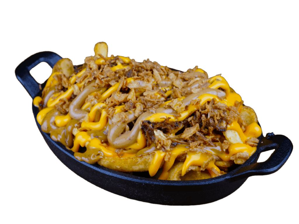 Patatas Dip bien cargadas con cheddar, pulled pork, mayonesa de bacon y lluvia de cebolla crujiente.
