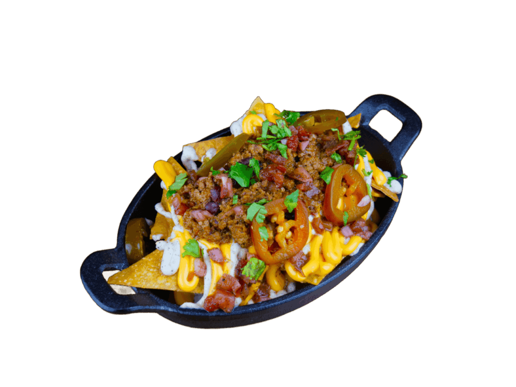 Tortillas de maíz fritas, chili con carne a fuego lento, salsa cheddar, ranchera casera, pico de gallo, jalapeños y un toque de cilantro. Crujientes, calientes y salvajes.